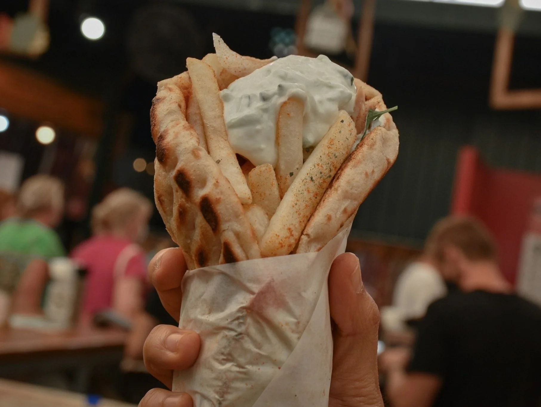 After exploring the town, we stopped for lunch at a local eatery called Vounaki. We couldn't resist the allure of a Greek gyro, packed with juicy chicken, fresh vegetables, and tzatziki sauce. The addition of fries in the wrap is always a fun twist. The flavors were incredible, and it was a much-anticipated taste of Greece after our time in Turkey.