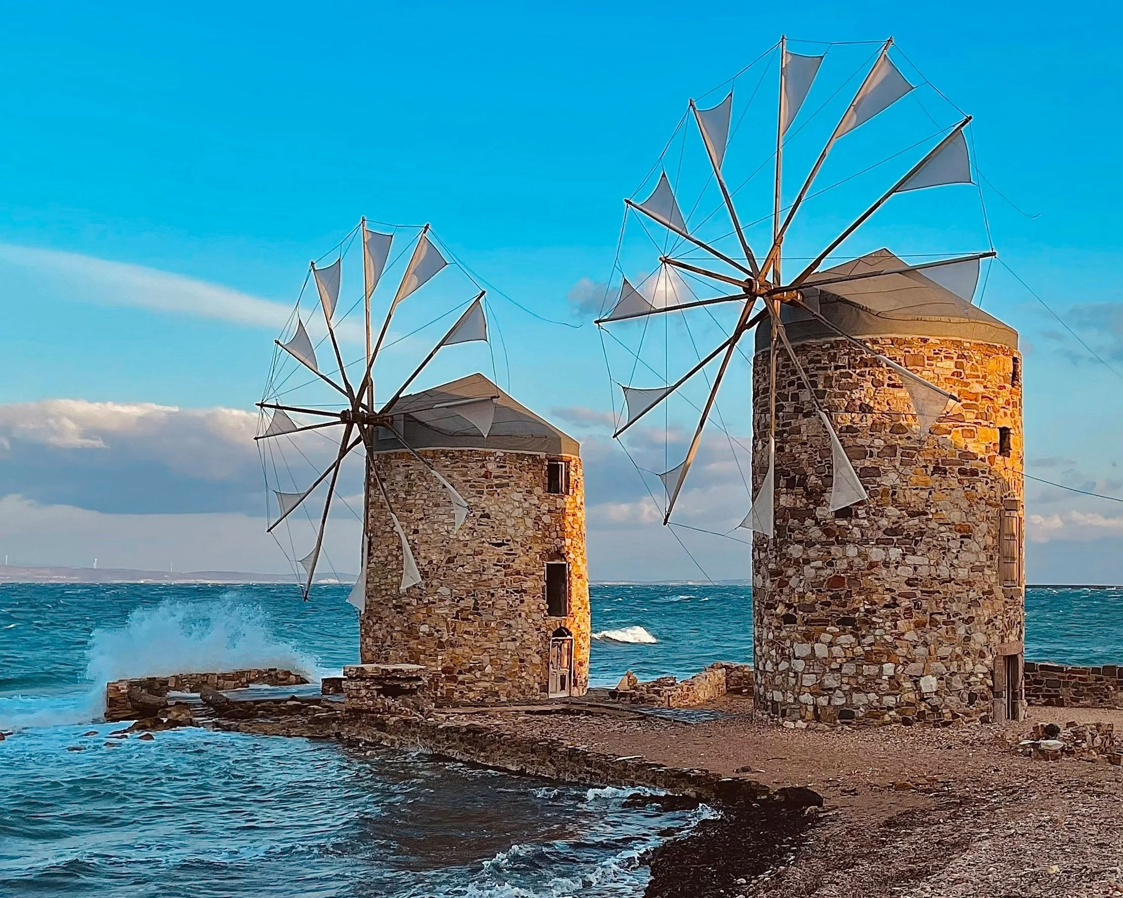 Our first stop was the stunning windmills located about 1.5 kilometers outside of Chios Town. Dating back to the 19th century, these beautifully restored windmills overlook the sparkling waters of the Aegean Sea. The sight of the windmills, complete with their sails, was something we had never seen before. The setting was picturesque, making it a perfect spot for photography and a leisurely stroll.